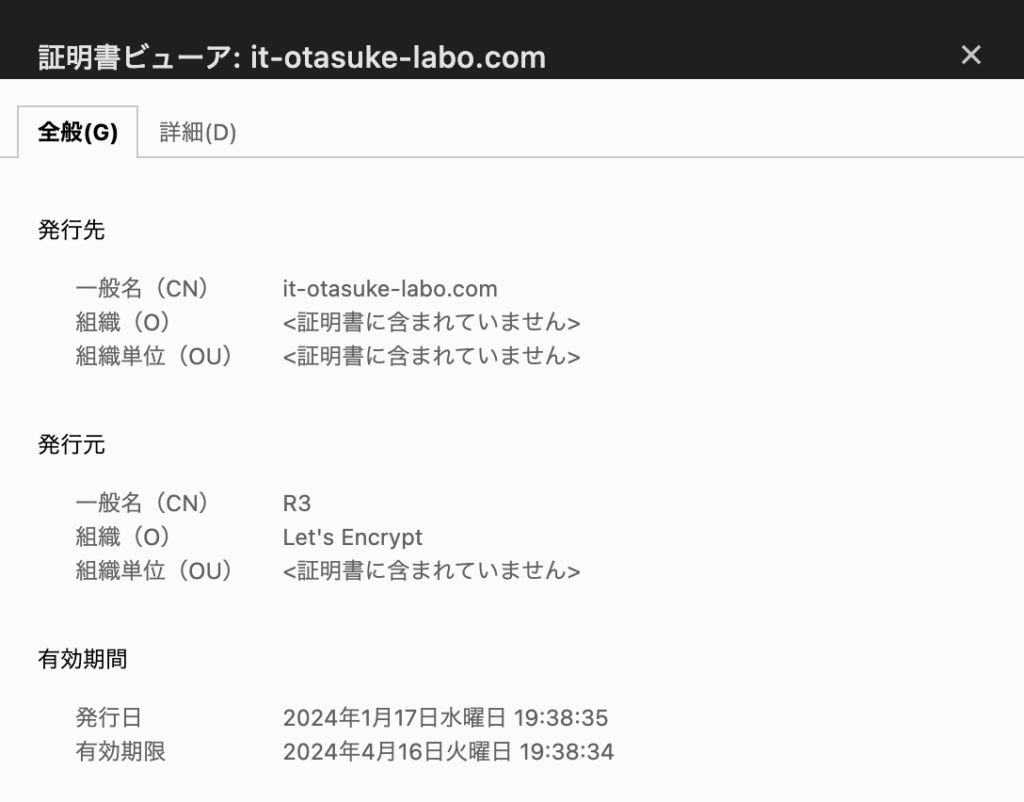 さらに「証明書は有効です」をクリックすると、SSL保護に使われている証明書を確認することができます。