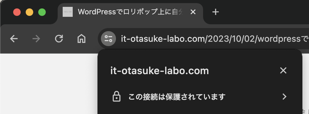 Chromeの場合、アドレスバーの一番左のボタンをクリックし、「この接続は保護されています」と表示されたらHTTPS通信が行われています。