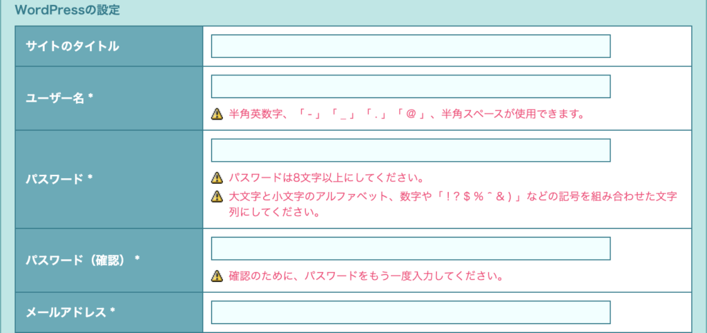 表示された項目を入力するだけで、簡単にWordPressをインストールすることができます。